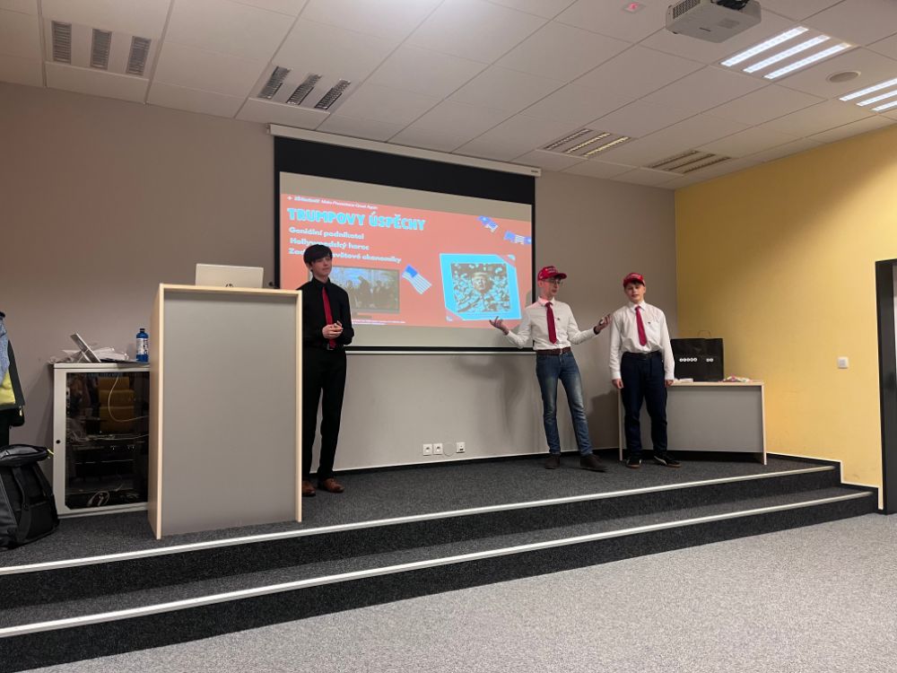 Po nich následoval výherní tým Make prezentace great again ve složení Davida, Alexe a Daniela. Zpočátku se prezentace zdála být scénkou z rodinné oslavy, kdy se příznivci Trumpa snaží převálcovat někoho jiného, nicméně nakonec se ukázalo, že nás chtěli poučit tím, jaké argumentační fauly použili.