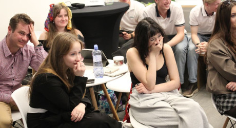 Tým Růžoví prezentoval také o humoru, ale i oni toto téma dokázali pojmout úplně jinak, než předchozí týmy. Interaktivní hrou zapojili celé obecenstvo a odpověděli s jejich pomocí na to, které situace komu již přijdou přes čáru a pomocí toho demonstrovali, jak každý člověk situace vnímá jinak.